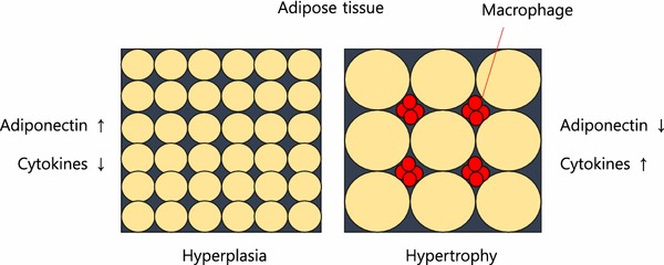 Fat storage can occur through hyperplasia (increase in number of fat cells) or hypertrophy (increase in size). Some ethnic groups are more prone to hypertrophy (south and east Asian). Hypertrophy in visceral fat (fat around the internal organs as opposed to fat under the skin) results in macrophage production of inflammatory cytokines. Eventually, the fat cells themselves can literally burst from too much volume.