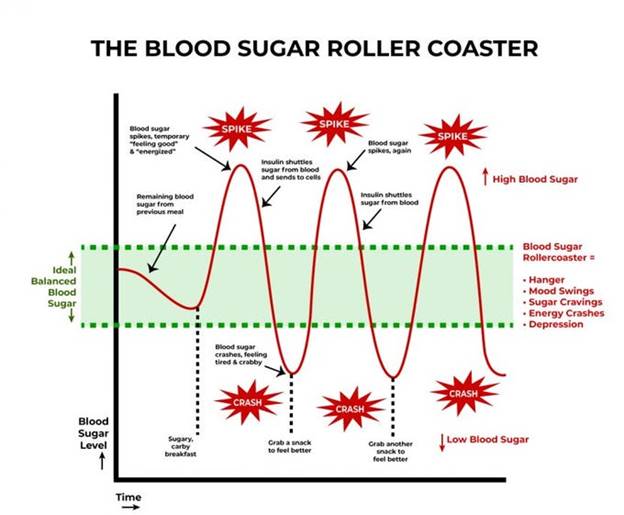 A meal with sugar and refined carbohydrates causes excessive swings in blood sugar and insulin levels, creating insulin resistance and downstream damage. Alcohol consumption contributes to this process. Fat consumption does not cause a rise in blood sugar or insulin levels. Protein consumption produces a minimal rise in insulin levels in the absence of IR.