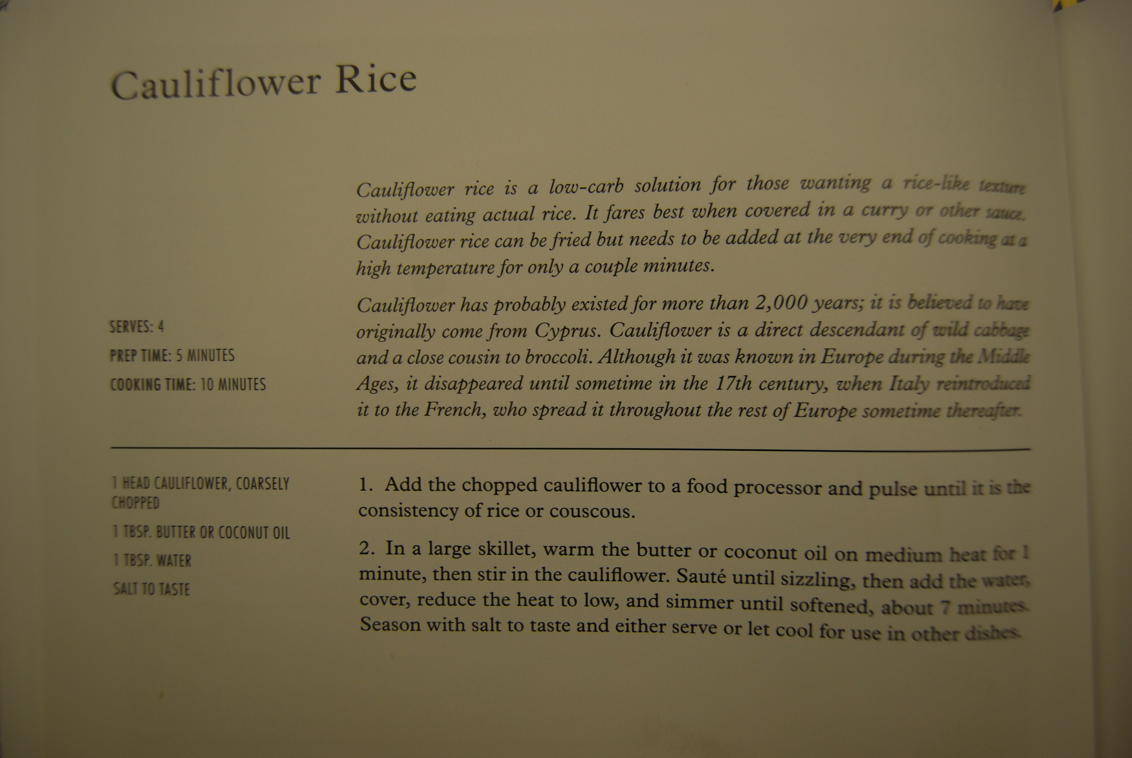 On the right there are two recipes. Kathie used a cauliflower “rice” recipe from the Ancestral Table cookbook. (no rice, just cauliflower, it has the consistency of cous cous)