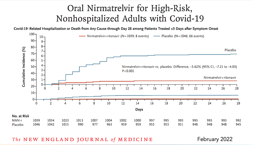 The results of a randomized placebo controlled clinical trial in high risk individuals has been published in the NEJM. The study was done just when Omicron hit. The study demonstrated an 89% reduction of hospitalizations and deaths by day 28 (absolute reduction of 6.2/100) with ZERO deaths in the Paxlovid group (7 in the placebo group). Paxlovid also had LESS side effects than placebo.