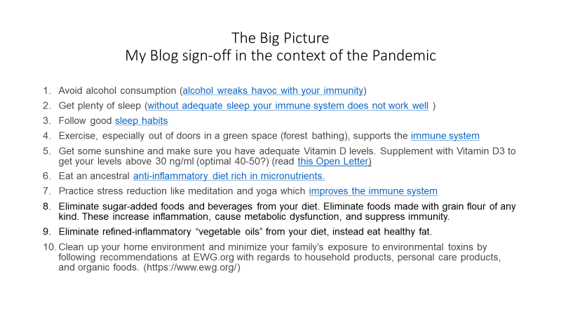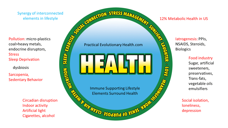 Factors that can quickly impact insulin and leptin resistance include all the components of an ancestral lifestyle depicted in my website graphic. A paleolithic or ancestral diet that eliminates sugar added foods and beverages, replacing those empty calories with nutrient dense foods, exercise, adequate restorative sleep, stress reduction, avoidance of environmental toxins, social connection. All of these affect health in general, mitigate insulin and leptin resistance, and support a balanced immune response to viral infection. The circle of health depicted below is surrounded by the many deleterious aspects of modern living. Thus, a mismatch between our evolutionary biology and present day life.