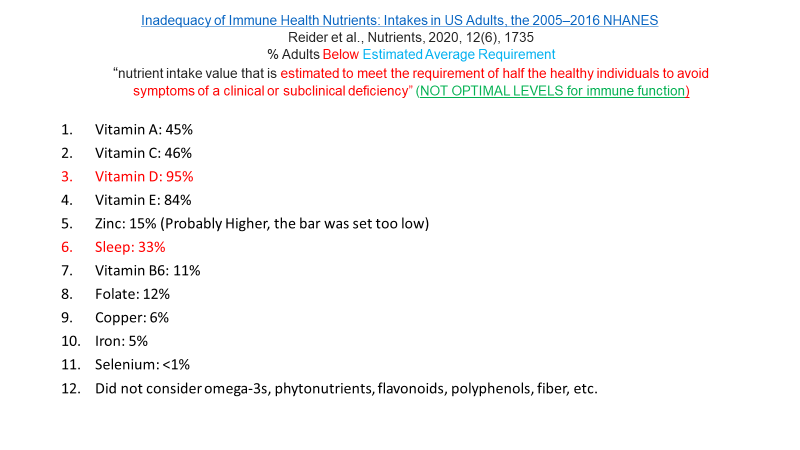 Yet most Americans are deficient in many of these essential nutrients as depicted here. The percentages represent the % of Americans that fall below the estimated amount required to prevent deficiency in HALF of adults (a very low standard).