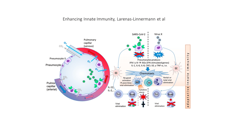SARS CoV2 on the left is compared to Virus X on the right. On the left interferon 1 (IFN) production and signaling is blocked by the virus, interfering with an effective and controlled immune response, on the right IFN is not blocked. A cascade of events results in TOO LITTLE, TOO LATE, AND THEN TOO MUCH of an immune response, producing a cytokine storm.