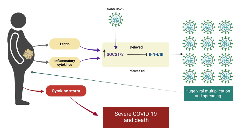 On the left Interferon production and signaling are normal and a successful immune response is mounted. On the right the presence of insulin and leptin resistance, associated with obesity results in an initial inadequate response and a late excessive response. TOO LITTLE, TOO LATE, THEN TOO MUCH.