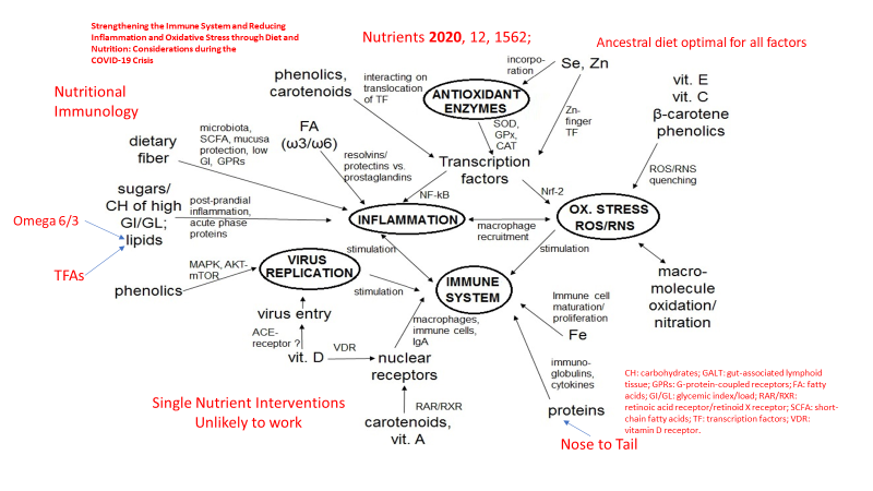 The following graphic from another nutrition review article, with red additions added by myself, demonstrates the complex interaction between nutrition and the two main components of our immune system, innate immunity (immediate response) and adaptive immunity (based on immune memory). Again red highlights added by yours truely.