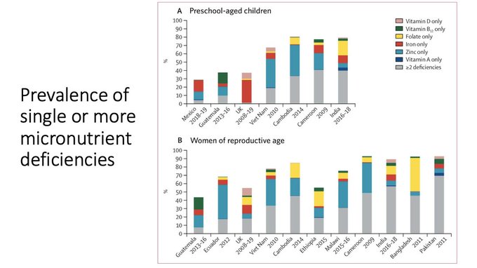 - The leading micronutrient deficiencies are: iron, zinc, folate, vitamin A, vitamin D, and B12. As many as 40% of children and 70% of women have multiple deficiencies at the same time. Animal-sourced foods are the only or best source of all those above except folate (which is found in liver, but plant-based foods like lentils are also a good source).