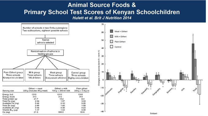 - We only have one experimental study looking at meat vs. less meat, which was done in Kenyan school children. It proved that adding meat increased their academic scores, their physical ability, and their behavior.