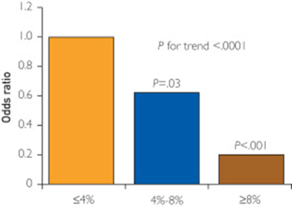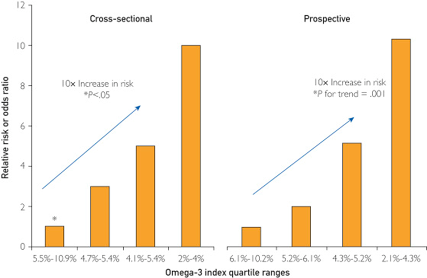 An omega-3 index of less than 4% is associated with increased CHD risk, particularly for sudden cardiac death. In contrast, an omega-3 index of more than 8% is associated with low CHD risk, whereas the range between 4% and 8% is considered intermediate risk