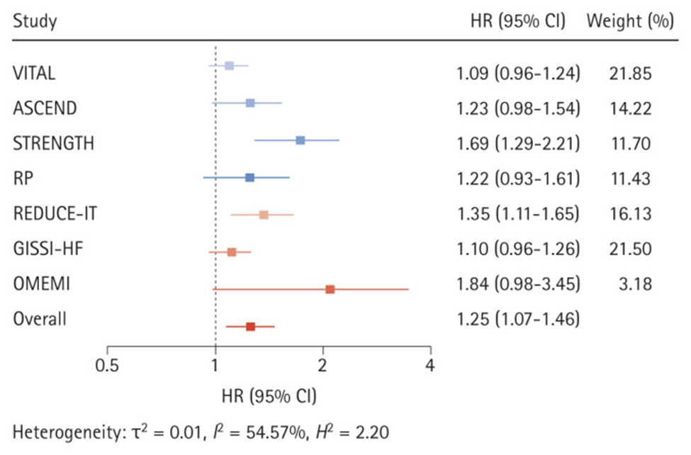 Effects of omega-3 fatty acid supplementation on the risk of atrial fibrillation. HR, hazard ratio; CI, confidence interval; VITAL, Vitamin D and Omega-3 Trial; ASCEND, A Study of Cardiovascular Events in Diabetes; STRENGTH, Statin Residual Risk with Epanova in High Cardiovascular Risk Patients with Hypertriglyceridemia; RP, Risk and Prevention Study; REDUCE-IT, Reduction of Cardiovascular Events With Icosapent Ethyl-Intervention Trial; GISSI-HF, Gruppo Italiano per lo Studio della Sopravvivenza nell’Insufficienza Cardiaca-Heart Failure; OMEMI, Omega-3 Fatty Acids in Elderly With Myocardial Infarction. Effects of omega-3 fatty acid supplementation on the risk of atrial fibrillation. HR, hazard ratio; CI, confidence interval; VITAL, Vitamin D and Omega-3 Trial; ASCEND, A Study of Cardiovascular Events in Diabetes; STRENGTH, Statin Residual Risk with Epanova in High Cardiovascular Risk Patients with Hypertriglyceridemia; RP, Risk and Prevention Study; REDUCE-IT, Reduction of Cardiovascular Events With Icosapent Ethyl-Intervention Trial; GISSI-HF, Gruppo Italiano per lo Studio della Sopravvivenza nell’Insufficienza Cardiaca-Heart Failure; OMEMI, Omega-3 Fatty Acids in Elderly With Myocardial Infarction. Effects of omega-3 fatty acid supplementation on the risk of atrial fibrillation. HR, hazard ratio; CI, confidence interval; VITAL, Vitamin D and Omega-3 Trial; ASCEND, A Study of Cardiovascular Events in Diabetes; STRENGTH, Statin Residual Risk with Epanova in High Cardiovascular Risk Patients with Hypertriglyceridemia; RP, Risk and Prevention Study; REDUCE-IT, Reduction of Cardiovascular Events With Icosapent Ethyl-Intervention Trial; GISSI-HF, Gruppo Italiano per lo Studio della Sopravvivenza nell’Insufficienza Cardiaca-Heart Failure; OMEMI, Omega-3 Fatty Acids in Elderly With Myocardial Infarction