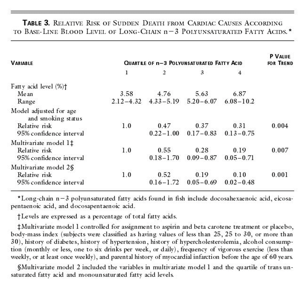 Base-line blood levels of long-chain n–3 fatty acids were inversely related to the risk of sudden death both before adjustment for potential confounders (P for trend = 0.004) and after such adjustment (P for trend = 0.007). As compared with men whose blood levels of long-chain n–3 fatty acids were in the lowest quartile, the relative risk of sudden death was significantly lower among men with levels in the third quartile (adjusted relative risk, 0.28; 95 percent confidence interval, 0.09 to 0.87) and the fourth quartile (adjusted relative risk, 0.19; 95 percent confidence interval, 0.05 to 0.71).