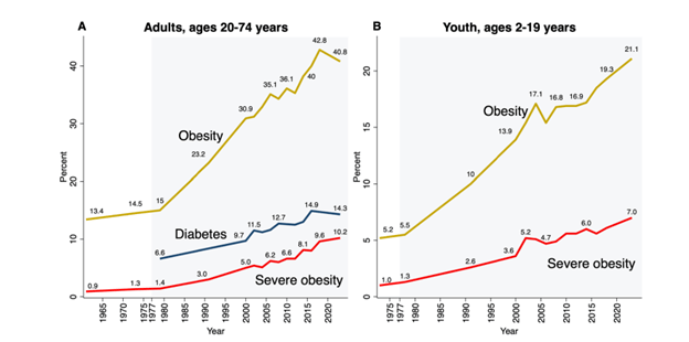 The following two graphics demonstrate the results of previous dietary guidelines that demonized healthy fats and animal sources of protein. The first shows the rise in obesity and diabetes but does not address the insulin resistance that evolves over decades before crossing the arbitrary threshold of diabetes, wreaking metabolic havoc long before diabetes occurs. The second graphic reveals how Americans consume 60% or more caloric intake in the form of refined carbohydrates (equivalent to sugar)