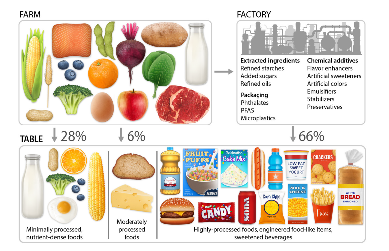 The following graphic displays the difference between minimally processed, moderately processed and highly processed foods according to the NOVA classification system (a system I will discuss and criticize in future posts). For now, suffice it to say that a simpler and more practical definition of “processed food” would include any food with one or more of the following: added sugar, artificial sweeteners, refined starch especially flour made from grains, refined “vegetable” oils, emulsifiers, artificial coloring, preservatives, and other additives found to disrupt the microbiome, intestinal barrier function or cause cancer. This graphic importantly covers the issue of food packaging which can contribute to the consumption of micro plastics, phthalates and PFAs
